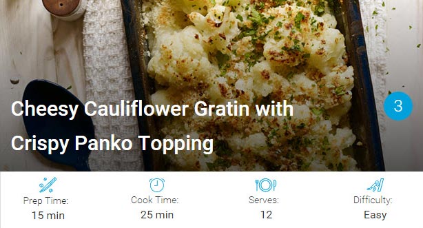 - Spoon cauliflower into prepared pan and pour cheese sauce over top; toss until well-mixed and then sprinkle with panko mixture. Bake until panko begins to brown, about 15 to 20 minutes. Serve garnished with parsley.