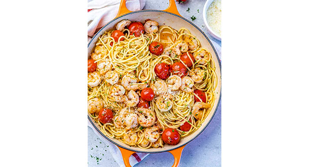 - Return the shrimp back to the pan, together with the cooked pasta and parmesan cheese, tossing with a pair of tongs to combine.