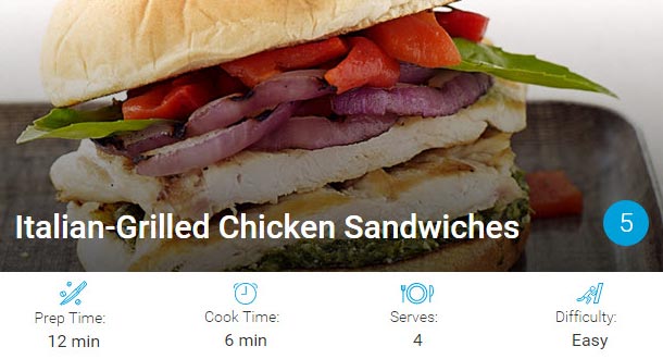 - Spread each bun bottom with 1 1/2 teaspoons pesto sauce; top each with 2 pieces chicken, 1 slice onion separated into rings, 3 basil leaves, 2 tablespoons roasted red pepper and a bun top.