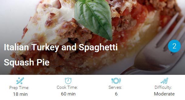 - Add ricotta cheese mixture and gently spread over squash. Pour tomato-turkey sauce over cheese mixture and sprinkle with mozzarella. Bake for 20 minutes. Remove from oven and let stand 5 minutes before slicing into 6 pieces.