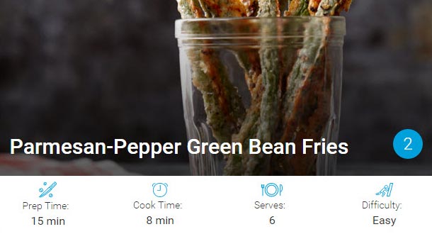 Dip each string bean into egg white mixture; gently shake off any excess. Next, dip in cheese mixture and turn to coat; place on prepared pan and repeat with remaining ingredients (make sure fries do not touch or overlap on pan, and rewhip egg white mixture a few times as you prep the fries).