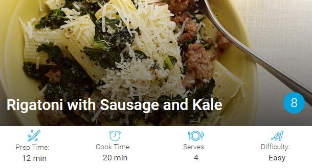 - Add broth to skillet and scrape up browned bits on bottom of skillet with a wooden spoon; season with salt and pepper. Cover skillet and reduce heat to low; cook until kale is tender, about 5 to 10 minutes. Stir in rigatoni; heat through.