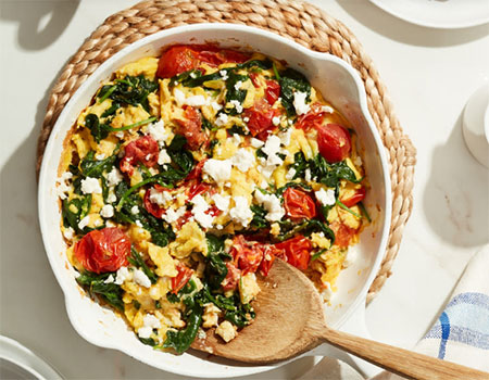 - Add spinach and tomato raisins to egg mixture; stir to coat.