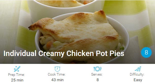 Don't have 8 ramekins or custard cups? Not to worry: Just spoon the filling into an 11 x 7-inch baking dish. Unroll crescent dough and press at perforations to seal. Top baking dish with full sheet of dough, letting ends hang over sides of dish (poke a few holes in crust). Bake until filling is bubbly and crust is golden, about 11 to 13 minutes. For a decorative touch, sprinkle dough with fresh thyme leaves before baking. For a sophisticated touch, substitute « cup of the broth for white wine.